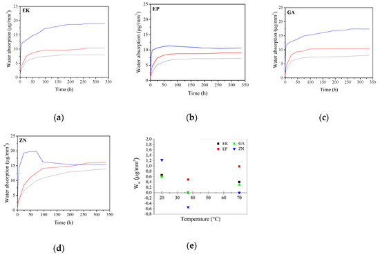 In regard to the study of the influence of temperature on water absorption of the disks versus time, the curves are reported in Figure 11.