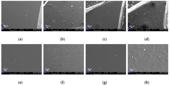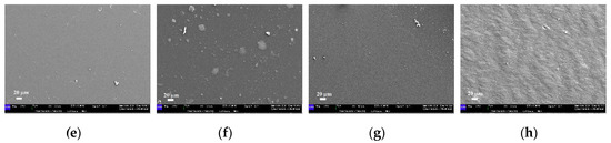 SEM images related to the samples disks as received, at two different magnifications, are shown in Figure 12. At a higher magnification, the surface of the EK sample (Figure 12a–e) appears rather smooth with small and sporadic superficial impurities or irregularities and ununiformly distributed. The EP and GA samples are characterized by a smooth surface too, but differently from what was observed in the EK sample, they present a larger number of impurities or irregularities on their surfaces (Figure 12b–f). However, in the case of the EP sample, such irregularities are in relief and characterized by a circular morphology, particularly evident at high magnification, with typical dimensions ranging from 5 to 50 μm. Finally, in regard to the polyurethane-based disk, the ZN sample surface presents rare impurities, but differently from what was observed in all the PETG-based disks, it appears wrinkled (particularly visible at high magnification) and is characterized by some small cavities (Figure 12d–h).