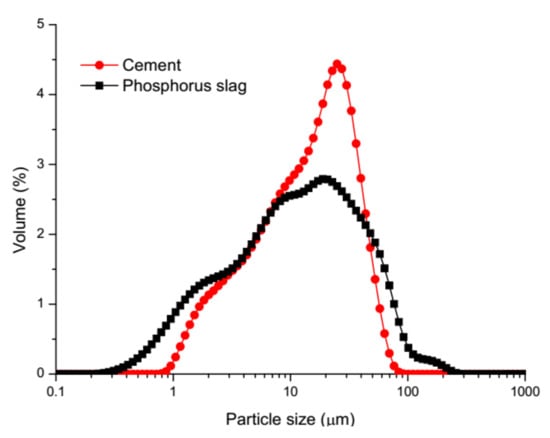 The P.O.42.5 cement (Conch Cement Corp., Anhui, China) and phosphorus slag (Hubei, China) were used. The fineness of P.O.42.5 cement and grinded phosphorus slag were 336 m2/kg and 300 m2/kg, respectively. Their particle size distributions are shown in Figure 1. The density of phosphorus slag and P.O.42.5 cement were 2856 kg/m3 and 3100 kg/m3, respectively. The chemical compositions of P.O.42.5 cement and grinded phosphorus slag are listed in Table 1. The XRD pattern of phosphorus slag is shown in Figure 2. Ordinary river sand was used for aggregates, with a fineness modulus of 2.4 and a bulk density of 1450 kg/m3. Tap water was used for mixing the samples. The mix proportions of the mortar samples are listed in Table 2. Curing conditions of samples were at 20 ± 1 °C and (90 ± 1%) RH.
