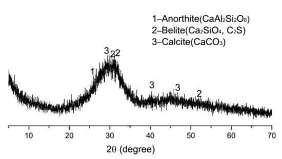 China is the second largest phosphorus reserve-rich country and has become one of the most intensively engaged in phosphorus-processing, which has eventually increased the risk to ecological deterioration from air storage of phosphogypsum and phosphorus slag [1]. Phosphogypsum has been made into belite–ferroaluminate cement products [2], non-autoclaved aerated concrete [3], backfilling materials [4,5], gypsum products [6], combined additives in cement [7]. Phosphorus slag can also be made into backfilling materials [8], porcelain [9], glass-ceramics [10], spherical-CaCO3 in the chemical industry [11], cast stone as decorative materials [12], mineral fillers in asphalt binders [13,14], and solidification additives for lead-contaminated soil [15]. However, it is a win-win solution for phosphorus slag to be regarded as the latent SCM (supplementary cementitious material), and thus avoiding environmental pollutions from air storage and CO2 emissions from cement usage. Phosphorus slag is one by-product discharged during the extracting process of phosphorus under high temperature electric furnace. Major components in phosphorus slag are SiO2 and CaO, minor components are Al2O3, Fe2O3, MgO, and P2O5. Contents of the glass network in granulated phosphorus slag may arrive at 85%~90% because of the high viscosity of the molten slag, similar to granulated blast furnace slag (GGBS) [16].