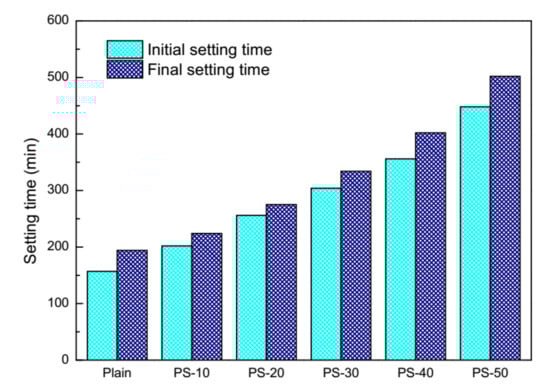 The water requirement of normal consistency for cement pastes is decreased by phosphorus slag in a marginal manner. As adjustments of water consumption are used here to fix the consistency of cement pastes, this physical parameter means the homogeneity degree of components in fresh pastes and the capacity of resistance to bleeding and stratification to a certain extent. The total decrease of water requirement is only 0.014 g, from 0.28 g of plain pastes to 0.266 g of cement pastes with 50% by mass of phosphorus slag. As the low activity of phosphorus slag is mentioned by [18,23,24], it can be assumed that in this situation the low activity of phosphorus slag cannot consume large quantities of water to have a pozzolanic reaction at early ages, and thus leaving the water requirement nearly unchanged.