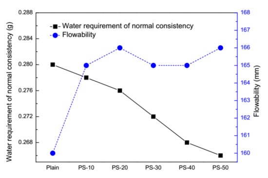The flowability of fresh mortars and water requirement of normal consistency for cement pastes is illustrated in Figure 4. The flowability of fresh mortars is slightly increased by phosphorus slag, but different dosages cannot make remarkable fluctuations. The value of plain pastes is 160 mm, the value of blended pastes with 10% by mass of phosphorus slag is 165 mm, and the rest of the others are 166 mm, 165 mm, 165 mm, and 166 mm.