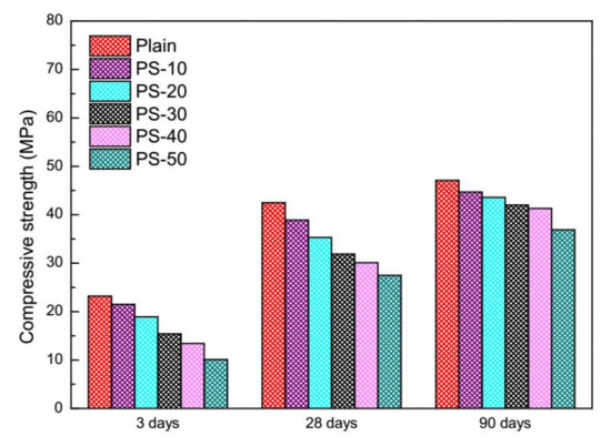 At an age of 28 days, the compressive strength of blended mortars with 50% by mass of phosphorus slag is 64.7% to that of plain mortars. At an age of 90 days, the compressive strength of blended mortars with 50% by mass of phosphorus slag rises to 78.3%. Degradations of phosphorus slag on compressive strength of concretes were presented by [42] in which the descending orders at 28 days and 90 days showed the same trends.
