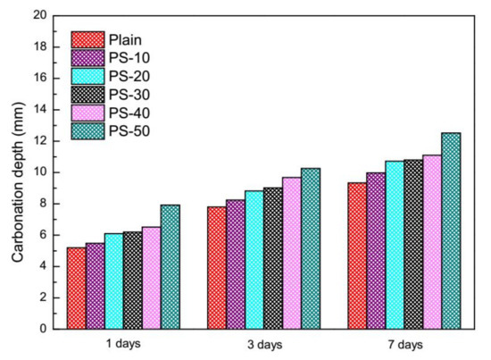 Carbonation depth of plain mortars and blended mortars are illustrated in Figure 6. One can see that the carbonation depth of blended mortars during the exposure times are deeper than those of plain mortars, which implies that resistance to carbonation of plain mortars is reduced by phosphorus slag. The ascending order of carbonation depth of blended mortars is regular to phosphorus slag from 10% to 50% (by mass). Damages on resistance to carbonation of concretes at early ages of three days and seven days were found by [50], but beneficial effects can be gained at later ages on the condition that the fineness of phosphorus slag are improved.