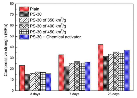 The physical activation and the chemical activation are evaluated by the compressive strength of blended mortars with 30% by mass of phosphorus slag at early ages (Figure 7). After the fineness activated, the compressive strength of blended mortars with phosphorus slag of 400 m2/kg is better than the rest of others at 3 days, 7 days, and 28 days. However, they are only 74.6%, 81.2%, and 84.8% to those of plain mortars. Although lower than the compressive strength of plain mortars either, the chemical activator shows its effects on the compressive strength of blended mortars with phosphorus slag of 300 m2/kg, 67.8% to that of plain mortars at an age of three days and 88.2% at last. The lowest compressive strength of blended mortars is the one with phosphorus slag of the coarsest fineness (300 m2/kg), which is 66.4%, 66.7%, and 75.1% to those of plain mortars at different ages.