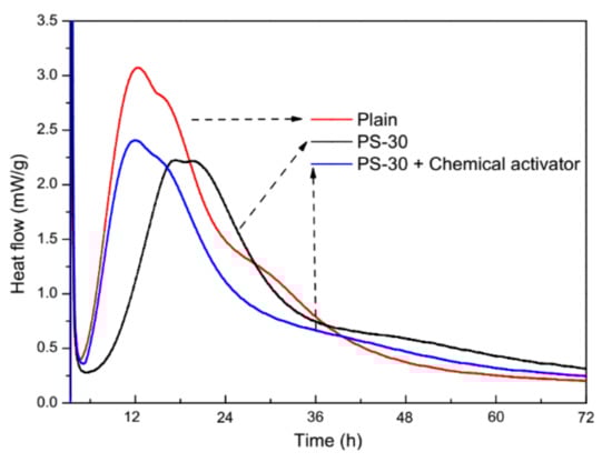 Hydration heat flow curves of plain pastes and blended pastes are demonstrated in Figure 8. The peak in the hydration heat flow curve of plain pastes is higher and shorter in time than the peak in the curve of blended pastes with 30% by mass of phosphorus slag, which attributes to the setting delay of phosphorus slag. After the chemical activator is added, the peak in the hydration heat flow curve is elevated higher and shorter in time, nearly the same to that of plain pastes. Changes in the hydration heat flow curves in Figure 8 have revealed that the chemical activator can compensate the setting delay of phosphorus slag on cement pastes.
