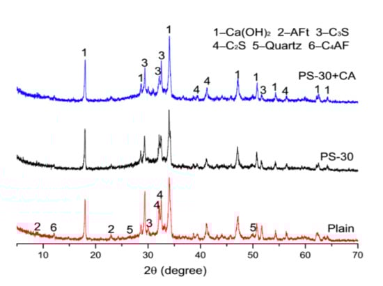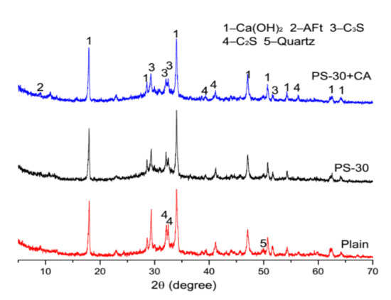 XRD patterns of plain pastes and cement pastes with 30% by mass of phosphorus slag and the chemical activator at 28 days.