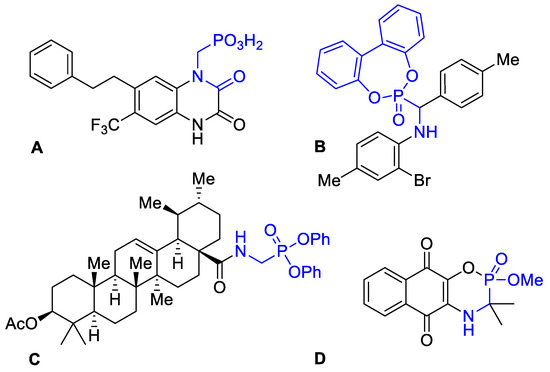 Aminophosphonic acid and aminophosphonates of potential medical importance. (A) AMPA (α-amino-3-hydroxy-5-methyl-4-isoxazolepropionic acid) receptor antagonist [15]; (B) antimicrobial aminophosphonate [16]; (C) anti-HIV agent [17]; (D) cytotoxic agent against human cervical carcinoma [18].