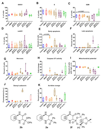 Biological activity of tested compounds on MV4-11 leukemia. (A–D) Cell cycle distribution including cells in (A) G0/G1, (B) S, (C) G2M and (D) death cells (sub G1). (E–G) Annexin V staining: (E) early apoptosis, (F) late apoptosis and (G) necrotic cells. (H) Activity of caspase 3/7 measured using Ac-DEVD-AMC caspase substrate. (I Mitochodrial potential measured with the use of JC-1 staining. (J,K) Analysis of autophagy using two methods with: (J) dansyl cadaverin and (K) acridine orange staining. MV4-11 cells were incubated for 48 h with two different concentrations of compound 2b, 2f and 2e: IC50 and 2 × IC50 calculated in 96 h proliferation test (MTT). As a control, selected anticancer agents were also used: cisplatin (abbreviated as CIS), camptothecin (CPT), and tamoxifen (TMX). DMSO was used in the concentration corresponding to the highest concentration of the compounds. The tests were repeated 3–5 times. Data are presented as box and whisker plot: the ends of the box are the upper and lower quartiles; the median is marked by a vertical line inside the box; the whiskers: min-max values. Statistical analysis: the Kruskal–Wallis test followed by Dunn’s multiple comparison test was performed. * p < 0.05, as compared to the control.