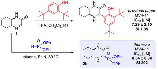 In our previous research, we reported on the synthesis and antiproliferative action of novel phenolic adducts of bicyclic imine 1 (Scheme 1) [30]. Two phenolic Mannich bases were found to be comparatively active to cisplatin with a noticeable increase of selectivity against cancer cell lines (one of them shown on the scheme). The tested compounds exhibit a resemblance to bioactive diketopiperazines in their bicyclic fragments. Our new goal was to synthesize phosphorus analogs of these structures and evaluate their cytotoxicity against cancer cell lines. Among a variety of synthetic methods for heterocyclic aminophosphonates formation [31], our group has focused on a convenient nucleophilic addition of dialkyl phosphites to a cyclic imine.