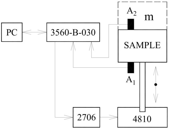 The mechanical vibration damping testing of the tested rubber composite materials was performed using the forced oscillation method. The transfer damping function was experimentally measured using the BK 4810 mini-shaker (Brüel and Kjær, Nærum, Denmark) in combination with a BK 3560-B-030 signal pulse multi-analyzer (Brüel and Kjær, Nærum, Denmark) and a BK 2706 power amplifier (Brüel and Kjær, Nærum, Denmark) at the frequency range of 2–3200 Hz (see Figure 1). Sine waves were generated by the mini-shaker. The acceleration amplitudes on the input and output sides of the investigated specimens were recorded by the BK 4393 A1 and A2 piezoelectric accelerometers (Brüel and Kjær, Nærum, Denmark). The accelerometers have these parameters: the frequency ranges from 0.5 to 16,500 Hz; the temperature range from −74 to 250 °C; and the weight is 2.4 g [24]. Measurements of the transfer damping function were performed for different inertial masses m (i.e., for 0, 90 and 500 g), which were located on the upper side of the harmonically loaded investigated samples (see Figure 1). Moreover, vibration damping properties of the investigated rubber samples with ground plane dimensions of 60 mm × 60 mm were performed for three different thicknesses (i.e., for 10, 15, and 20 mm) of these materials. The view of the experimental setup used for the vibration damping testing is shown in Figure 2. Each measurement was repeated 10 times at an ambient temperature of 22 °C.