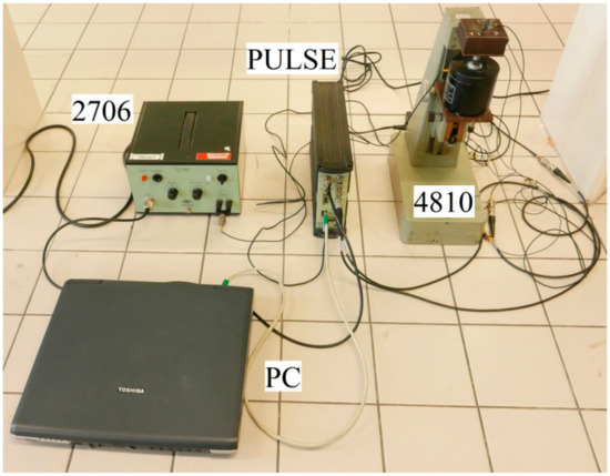 View of the experimental setup used for the vibration damping testing. Legend of the abbreviations: PC—personal computer; PULSE-signal pulse multi-analyzer; 2706—power amplifier; 4810—mini-shaker.