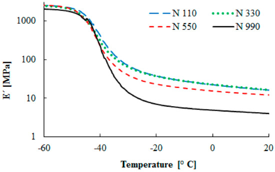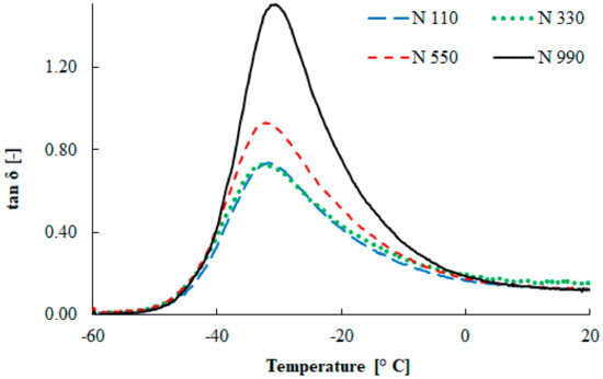 During heating, the elastic modulus of the studied compounds decreased in the temperature range from −50 °C to −25 °C. The most rapid decrease of the elastic modulus was observed for the compound containing the N 990 carbon black type. On the other hand, the highest values of the elastic modulus were obtained for the compounds with the N 110 and N 330 carbon black types. This is connected with the decreasing carbon black particle sizes and the increasing surface area.