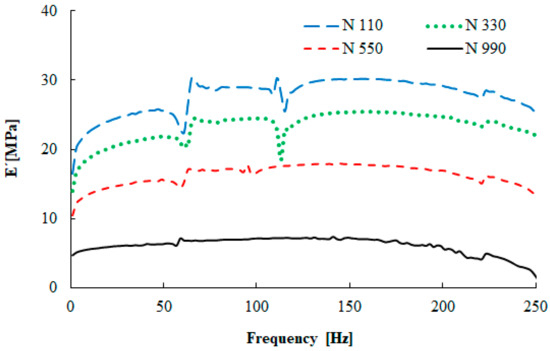 Significant changes of the storage modulus depending on the frequency for SBR compounds with the N 110, N 330, and N 550 carbon blacks are evident in Figure 5. There is a moderate increase of the storage modulus with the frequency up to 180 Hz. The filler with the smallest primary particle size (N 110) exhibited the highest storage modulus values, while N 990 gave the lowest values. This is connected with the filler–polymer interaction. This fact depends on the filler’s primary particle size, as well as its structure [28].