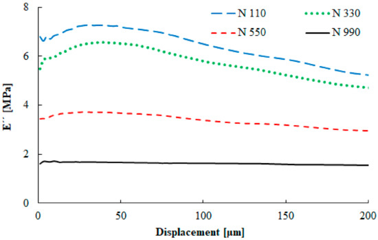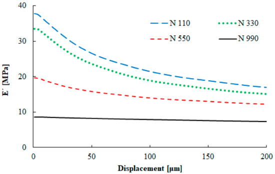 The next measurement was performed in order to evaluate the deformation dependence of the tested samples on their dynamic properties. The elastic modulus dependence on the displacement is shown in Figure 7. The effects of the carbon black particle size and structure were measured by this experiment. The compound with the smallest primary particle size gave the highest elastic modulus value, while that with the largest particle sizes showed almost no stiffening effect and had almost constant elastic modulus during the whole deformation range. High elastic moduli at low deformation levels are caused by the filler–filler interaction, as explained by Payne [31]. The smallest particles with higher carbon black structures created stronger filler–filler network in comparison with larger particles and a lower carbon black structures. With the increasing deformation, the filler network is destroyed and the interaction between the rubber and carbon black becomes the main factor.