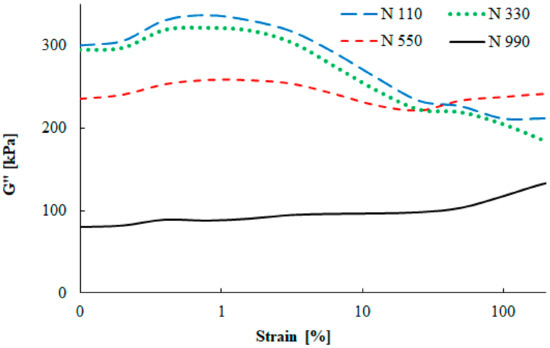 The dependence of the filler–filler interaction for compounds with the N 110, N 330, N 550, and N 990 carbon black types is depicted in Figure 9. A strong dependence of the shear storage modulus on the filler particle size is visible, similarly to the DMA testing. Large carbon black particles (N 990) are characterized by a low reinforcing effect, while small particles (N 110) cause a pronounced increase of the storage modulus. Figure 10 shows the strain amplitude dependence of the loss modulus of four carbon black grades. Similarly to the DMA measurements, the shear loss modulus was highest for the N 110 type, while for the N 990 type it was the lowest. The maximum value of the loss modulus was observed at 1% strain, which is fully connected with the maximal damping properties.