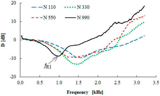 Examples of the frequency dependencies of the transfer damping function of the tested rubber composites measuring t = 10 mm in thickness with different carbon black particle sizes are shown in Figure 12. It is evident from this comparison that the size of the carbon black particles has a significant influence on the vibration damping properties. It can be concluded that the material´s ability to damp mechanical vibration generally increased with an increase in the carbon black particle size. This is caused by lower stiffness (or by higher damping) of the rubber composites, which were produced with larger carbon black particle sizes. These facts result in a higher transformation of input mechanical energy into heat during forced oscillations [37] and a decrease in the values of the damped and undamped natural frequencies [38]. Therefore, the first resonance frequency (fR1) value was shifted to the left (see Figure 12) with an increase in the carbon black particle size, i.e., from 1520 (N 110) to 968 Hz (N 990), as indicated in Table 4. These findings are in excellent agreement with the results that were experimentally determined by the abovementioned methods, namely the hardness, tensile, shear, and viscoelastic measurements. It was verified in these cases that the increasing carbon black particle size led to a decrease of the break stress, the Shore A hardness, and the storage moduli E´ and G´. In contrast, the rebound resilience was higher for these particle sizes.