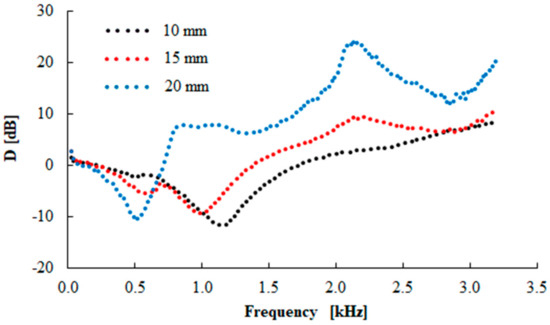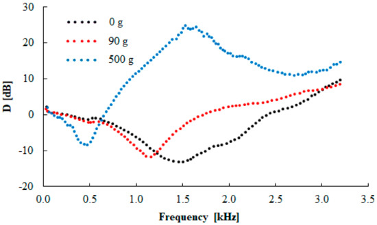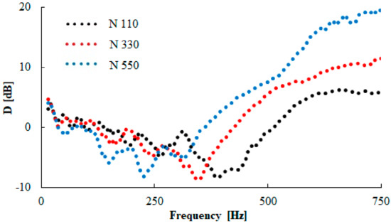 Frequency dependence of the transfer damping function (D) for the tested rubber composite measuring t = 10 mm in thickness, without inertial mass (m = 0 g).