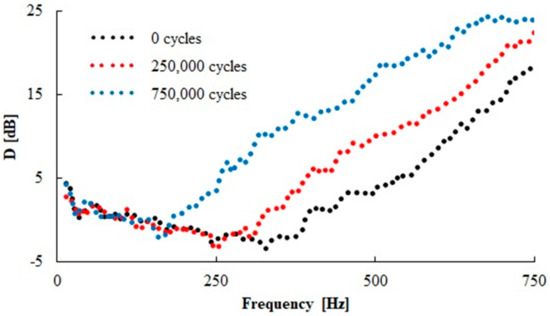 Effect of number of loading cycles on frequency dependencies of the transfer damping function (D) for the N 330 rubber composite measuring t = 20 mm in thickness, with inertial mass m = 500 g.