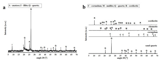 Raw materials used for the preparation of geopolymer binder were all commercially available products: a metakaolinite-rich material Mefisto L05 produced by the calcination of kaolinitic claystone at about 750 °C in a rotary kiln (České lupkové závody, a.s., Nové Strašecí, Czech Republic), potassium silicate (Vodní sklo, a.s., Prague, Czech Republic) and potassium hydroxide pellets (G.R. grade, 88.2 wt % KOH, Lach-Ner, s.r.o., Neratovice, Czech Republic). Sand quartz (Provodínské písky, a.s., Provodín Czech Republic), chamotte (České lupkové závody, a.s., Czech Republic), cordierite (České lupkové závody, a.s., Czech Republic) and corundum (Koltex color s.r.o., Mnichovo Hradiště, Czech Republic) of grain size 0–2 mm were used as natural fillers for the preparation of the geopolymer composites. The chemical compositions of the raw materials are given in Table 1, their physical properties are summarized in Table 2 and the results of X-ray diffraction analysis (XRD, Bruker, Billerica, MA, USA) of aluminosilicate Mefisto L05 and fillers are shown in Figure 1.