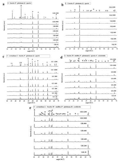 Quartz was a quite inert phase that does not react with the geopolymer matrix; therefore, no differences between the XRD patterns of GB-30 (tested at room temperature) and GQ-1000 (tested in situ at temperature 1000 °C) were observed. Changes in the XRD pattern were captured after the exposure to 1200 °C, when phases of leucite occurred. Similar results (presence of leucite) of geopolymer composites with quartz after heat exposure were observed by Kamseu et al. [27]. XRD results of GC, GS, and GR samples follow the same path as a GQ samples. Phase of leucite were detected in GC, GS, and GR samples after exposure to 1000 °C. Lin et al. [38] observed the presence of crystalline leucite in the prepared geopolymer composites with the addition of corundum after heat exposure to 1000 °C. Mullite (Al6Si2O13) is the main component of chamotte as shown in Figure 1b. Similarly, the cordierite (Mg2Al4Si5O18) is the main component of cordierite.