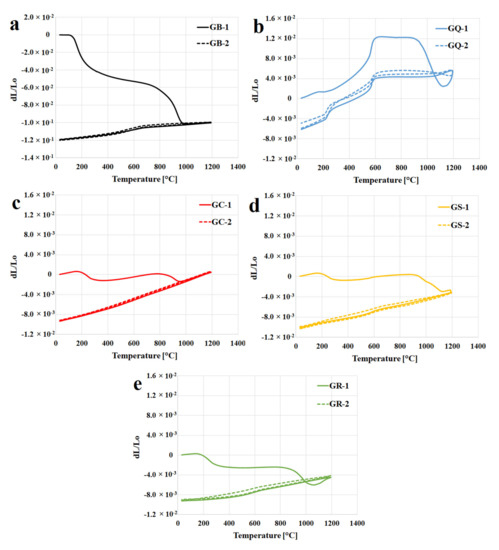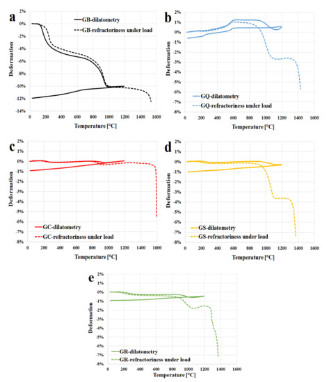 Figure 5 represents the results of comparison of refractoriness under load in relation to dilatometry of geopolymer binder (Figure 5a) and composites (Figure 5b—quartz; Figure 5c—corundum; Figure 5d—chamotte; Figure 5e—cordierite). According to the standard, Figure 5 shows a dependence of relative deflection on the temperature, temperatures T0.5 and T5 represent temperatures at which 0.5% and 5% deformation of the cylinder will occur against its maximum height (height also changes due to thermal expansion). The determination of the refractoriness under load of GB (Figure 5a) displayed that the T0.5 and T5 values were obtained for temperatures at 200 °C and 600 °C. This rapid decrease is probably due to dehydroxylation as it was described in dilatometry. From the comparison, it was evident that the curves of refractoriness under load and dilatometry were the same up to 1200 °C (the temperature limit of the dilatometry). Therefore, the refractoriness under load did not affect the shape changes of geopolymer binder up to 1200 °C, but the dilatation was measured.