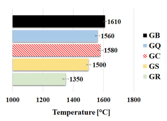 The results of refractoriness for the geopolymer binder and composites are shown in Figure 4. The determined pyrometric cones refractoriness of geopolymer binder and composites was expressed by the results of pyrometric reference cones that melted simultaneously with the tested sample. From the result of refractoriness of geopolymer binder (GB), it is evident that the binder can withstand high temperatures of up to 1610 °C (melting does not occur before this temperature). Application of the fillers into the geopolymer binders reduces their refractoriness. The decrease in refractoriness may be due to earlier sintering of filler and the geopolymer matrix. The results indicated different interphase processes during sintering of binder compared to geopolymer composites. Geopolymer composites with the addition of sand (GQ) or corundum (GC) experienced only a slight decrease in refractoriness compared to GB. The biggest drop of refractoriness value was observed in the geopolymer composite with the addition of cordierite (GR). The drop in refractoriness of GR may be related to the melting point of the filler. The melting point of cordierite is around 1400 °C, depending on the condition [48]. The best refractoriness of geopolymer composite was achieved with corundum (1580 °C) followed by quartz (1560 °C), chamotte (1500 °C), and lastly cordierite (1350 °C). According to ASTM C71 [49], the geopolymer binder and composites presented in this study can be considered as refractory material.