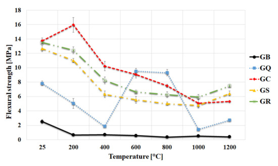 Average values of flexural strength of geopolymer binder and geopolymer composites before and after heat exposure are depicted in Figure 6. The addition of fillers had a significantly positive effect on the flexural strengths. Geopolymer composites with the quartz, corundum, chamotte, and cordierite as fillers exhibited much higher flexural strength than the corresponding geopolymer binder. The changes in flexural strengths after exposure to increasing temperatures followed the decreasing path up to 1000 °C. The heating temperature of 1200 °C resulted in a slight increase in flexural strength. This finding may be explained by the changes in phase composition (formation of leucite). The cause of the drop in flexural strength of GB during exposure to high temperature was probably due to the dehydration and internal cracking of GB during heating [29]. A similar drop was also observed for GC, GS, and GR after heating to 400 °C, but the drop in the flexural strength was not so big because the fillers are able to alleviate the flexural stress caused by shrinkage of the GB. A large increase in flexural strength was observed after heating the geopolymer composite filled with quartz to 600 °C and 800 °C. This can be interpreted as a result of phase inversion of quartz at 573 °C (from the room temperature stable alpha phase to the beta phase) [25].