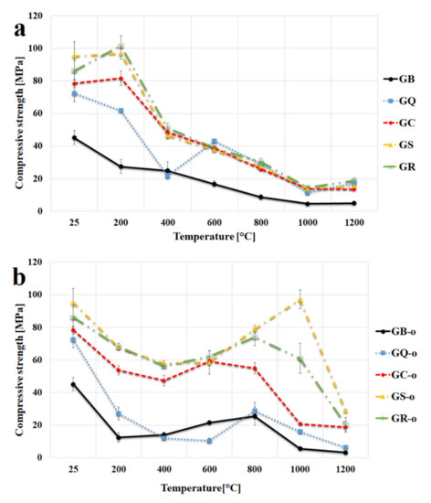 As could be expected, the addition of fillers had a beneficial effect on the mechanical properties of geopolymer composites either at laboratory temperature or an elevated temperature. The addition of fillers mitigates the shrinkage of the geopolymer binders (the material does not crack due to heating). The results indicate decreases in compressive strength of geopolymer composites with increasing temperature, which were also previously published [23,25,30,47,56]. A slight increase in compressive strength after exposure to 200 °C was observed with GC, GS, and GR samples. It seems, in view of previous research results [47], the strengthening of the materials can be attributed to the stiffening of the gel and the increase in surface forces between the particles due to the release of adsorbed moisture or the promotion of polycondensation between chain-like geopolymer gels. The exposure to 1200 °C also increased the compressive strength of geopolymer composites. Similarly to flexural strength, the increase was probably due to the formation of a new crystalline phase of leucite. A reduction in compressive strength was observed with the sample of GQ after exposure to 400 °C. The deterioration in compressive strength is possibly due to the change of quartz from the stable alpha phase to the beta phase [25].
