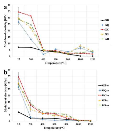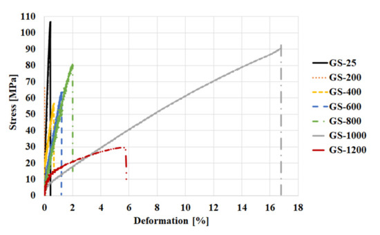 Figure 8b presents the modulus of elasticity of geopolymer binder and composites tested in situ at temperature from 25 °C to 1200 °C. The tendency of the modulus of elasticity in situ is to track the same decreasing path with increasing temperature as in Figure 8a. The modulus of elasticity of tested materials was almost zero after heated up to 1000 °C and 1200 °C. The samples had more plastic-like behavior with the higher temperature as shown in the Figure 9. Figure 9 displays the curves of stress-deformation of GS samples tested in situ at different temperatures. The presented curves were selected as the most representative out of the six measured curves at each examined temperature. Figure 9 shows only the GS sample because similar dependences applies to the other samples. According to these curves the GS exhibited a linear elastic behavior from laboratory temperature up to 800 °C. At higher temperatures, from 1000 °C to 1200 °C, the behavior of GS was plastic. These results are in agreement with previously published results, which exhibited similar curves of geopolymer prepared from fly ash [36]. The plastic behavior of geopolymer composites at high temperature was also shown in Figure 5 (refractoriness under load), where the crystallization of new phases from 1000 °C caused the deformation of tested materials under load.