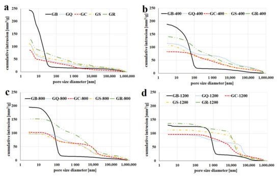 Mercury intrusion porosimetry was used to determine the pore size distribution in geopolymer binder and composites after hardening at an ambient temperature and after heat exposure. Figure 10 shows the cumulative intrusion volume of geopolymer binder and composites at a laboratory temperature (Figure 10a) and after exposure to 400 (Figure 10b), 800 (Figure 10c), and 1200 °C (Figure 10d). The GB contained capillary pores larger than 100 nm and gel pores smaller than 10 nm after hardening at laboratory temperature. It can be seen that the pore volume rapidly dropped (from 250 to 130 mm3/g) and the pore size increased (especially from a temperature above 800 °C) due to the shrinkage and crystallization of new phases in the geopolymer matrix with elevated temperature in the GB. Average pore size diameter rose from 10 nm (25 °C) to 100 nm (1200 °C). The results correlate to some extent with a previous study which measured the pore size distribution of geopolymer binder prepared from metakaolin and sodium alkaline activator [47]. They found out that the pore volume was 280 mm3/g at room temperature and dropped to 40 mm3/g at the temperature of 1000 °C.