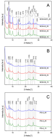 Diffractograms of the zeolitic samples of MCM-22, MCM-36, and ITQ-2 series are presented in Figure 1. Diffraction patterns recorded for the MCM-22 zeolites were compared with diffractogram of MCM-22(P)_50—precursor of the MCM-22_50 sample (Figure 1A). The (0 0 2) reflection at 6.6°θ, indicates the ordered layered structure with the d-spacing of 2.6 nm. Calcination of MCM-22(P) resulted in thermal removal of interlayer templates and condensation of the zeolite layers with the formation of microporous 3D structure. Therefore, in the calcined samples of MCM-22 series the inter-layer reflection (0 0 2) overlaps with an intra-layer reflection (1 0 0), proving the formation of 3D zeolite. Diffractograms recorded for the MCM-22 samples contain reflections characteristics of this type of the zeolite structure [24]. Intensity of the reflections decreased with a decrease in the Si/Al ratio, indicating the formation of the less ordered zeolite structure for the alumina-rich samples. Intercalation of MCM-22(P) with silica pillars, resulting in MCM-36, decreased intensity of the diffraction peaks characteristic of the MCM-22 structure (Figure 1B). This effect is related to the ordered 2D structure, which is limited only to the zeolite layers of MCM-36 in contrast to MCM-22 with the 3D zeolitic structure. The most significant decrease in the reflection intensity was observed for MCM-36_50, showing that the samples with the higher aluminum content are less effectively intercalated than zeolites with the lower alumina content. It is possible that the samples with larger alumina content, due to greater charging of the zeolite layers, are less susceptible to swelling and intercalation. The leak of (0 0 2) reflection in diffractograms of the MCM-36 samples is related to spatial modification of the zeolite layers ordering due to pillarization or delamination processes, which result in the loss of perpendicular order with the respect to c axis. Also, in the case of the ITQ-2 samples (Figure 1C) the intensity of the reflections significantly decreased comparing to MCM-22. However, intensity of these reflections was higher than in diffractograms of the MCM-36 samples, indicating that the obtained ITQ-2 samples are not fully delaminated. The analysis of the average MCM-22 crystallite sizes, <DXRD> shows that such crystallites are also present in the samples of MCM-36 and ITQ-2 series (Table 1). The size of these crystallites in these zeolites is significantly smaller than in the series of MCM-22 zeolites. Thus, not all zeolite layers are separated by silica pillars or delamination in MCM-36 and ITQ-2 zeolites, respectively. Apart from the reflections characteristic of MCM-22, additional peak at 8.8° (marked by asterix) is present in diffractograms of all zeolites obtained from MCM-22_50(P). Thus, the additional phase, represented by this reflection, was possibly formed during the synthesis of MCM-22_50(P). The identification of the phase based only on one diffraction peak is very speculative; however, it could be suggested that this reflection is assigned to the small contribution of ZSM-5. First of all, ZSM-5, has the two most intensive reflections exactly at 8.8° and about 8.0° (possibly overlapped with the (1 0 1) reflection of MCM-22). The third strongest diffraction peak of ZSM-5 should be at about 23° and therefore may be overlapped by (1 0 6) reflection of MCM-22. Secondly, the synthesis of ZSM-5 with using hexamethylene imine, used also in the synthesis of MCM-22(P), was reported in scientific literature [25]. However, as it was already mentioned, this hypothesis is very speculative and additional studies should be done to explain this scientific problem.
