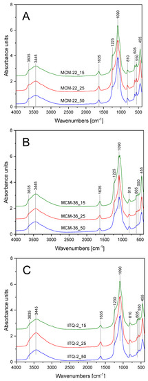 FT-IR spectra of the zeolite samples are presented in Figure 2, while the assignment of the characteristic bands is shown in Table 2. Spectra recorded for all the samples are very similar. The main difference is related to higher intensity of the band at about 1225 cm−1, assigned to stretching, asymmetric, and symmetric vibrations of T-O-T (where: T = Si and Al) for the MCM-22 series (Figure 2A) comparing to MCM-36 (Figure 2B) and ITQ-2 (Figure 2C). It could be explained by the 3D structure of MCM-22 and therefore the larger number of the ≡T-O-T≡ bridges comparing to MCM-36 and ITQ-2 with the layered structure. Decreased intensity of the bands at 455 and 550 cm−1, characteristic of Al-O-Si deformation and O-Al-O blending vibrations, in the samples of the layered MCM-36 and ITQ-2 zeolites, in contrast to MCM-22 zeolites with 3D structure, are possibly related to differences in their structural ordering. Moreover, for the layered MCM-36 and ITQ-2 zeolites intensity of these bands decreased with an increase in the Si/Al molar ratio indicating that delamination and intercalation of MCM-22(P) is more effective for the samples with the lower aluminum content. It is in full agreement with the results of XRD studies.