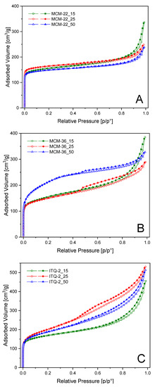 Dinitrogen adsorption–desorption isotherms of MCM-22 (A), MCM-36 (B), and ITQ-2 (C) zeolites.