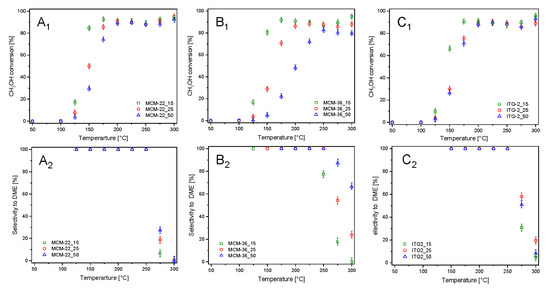 Results of catalytic studies of methanol to dimethyl ether (DME) dehydration are presented in Figure 5. For the series of MCM-22 catalysts the methanol to DME conversion started at about 100 °C and increased to 175–200 °C, reaching about 89–92%, then up to 250 °C the level of methanol conversion was nearly constant and above this temperature small increase in CH3OH conversion was observed (Figure 5A1). The incomplete methanol conversion in the range of 175–250 °C is assigned to the thermodynamic restrictions, as methanol dehydration is a slightly exothermic reaction and therefore an increase in the reaction temperature shifts the free reaction enthalpy to higher values, what results in the reaction equilibrium lowering [33]. The selectivity to DME of 100% was up to 250 °C (Figure 5A2). An increase in methanol conversion and decrease in the selectivity to DME, observed above 250 °C, are related to the formation of formaldehyde, carbon monoxide and methane, which are the side reaction products. Catalytic activity of the MCM-22 samples strongly depended on aluminum content, indicating a very important role of surface acidity in methanol dehydration. The methanol conversion profile of MCM-22_15 is shifted into lower temperatures by about 25 °C in relation to MCM-22_50. Selectivity to DME decreased with the increasing aluminum content in the samples. Within the MCM-36 series of the samples more significant differences in catalytic activity were observed (Figure 5B1). In this case the methanol conversion profile of MCM-36_15 is shifted into lower temperatures by about 65 °C in comparison to MCM-36_50. For the most active catalyst of this series, MCM-36_15, maximal methanol conversion on the level about 91% was obtained at 175 °C. For MCM-36_25 maximal methanol conversion of 88% was achieved at about 225 °C, while in the case of MCM-36_50, the conversion of 82% was obtained at 250 °C. At temperature above 200 °C, the selectivity to DME decreased more intensively due to the formation of the side reaction products, mainly formaldehyde, carbon monoxide and methane, for the samples with the higher aluminum content (Figure 5B2). Thus, also in this series of the samples an increased surface acidity resulted in higher catalytic activity and reduced high-temperature selectivity to DME. Also, in the case of the ITQ-2 series, the sample with the highest aluminum content, ITQ-2_15, presented better catalytic activity at lower temperatures comparing to zeolites with the lower aluminum content, ITQ-2_25 and ITQ-2_50 (Figure 5C1). In this case the methanol conversion profile of ITQ-2_15 is shifted into lower temperatures by about 15–20 °C in relation to other catalysts of this series. Methanol conversion profiles of ITQ-2_25 and ITQ-2_50 are very close each to other due to a very similar aluminum content and therefore also surface acidity (cf. Table 1). DME was formed with the selectivity of 100% up to 250 °C (Figure 5C2), while at higher temperatures the selective to DME drastically dropped down due to the formation of the side reaction products—mainly formaldehyde, carbon monoxide, and methane.