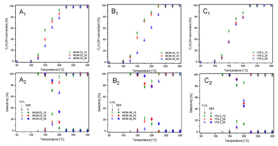 The zeolitic samples were also studied as catalysts for ethanol dehydration (Figure 6). In this case the main reaction products are diethyl ether (DEE) and ethylene. Due to thermodynamical restrictions, DEE is produced at lower temperatures, while ethylene is the main reaction product at elevated temperatures. Moreover, at higher temperatures, the formation of small amount of acetaldehyde, carbon monoxide, methane, ethane, and C3 hydrocarbons was observed. For all series of the zeolitic catalysts—MCM-22, MCM-36, and ITQ-6—ethanol conversion stared at about 100 °C and increased to 225–250 °C, reaching 98–100% (Figure 6A1–C1). For all series of the catalysts, the correlation between the content of aluminum and catalytic activity in ethanol conversion was observed, indicating a very important role of the surface acidity in this reaction. However, the shift of ethanol conversion profiles of the catalysts with various aluminum contents is less significant compared to these same catalysts tested in methanol dehydration. Among the studied samples, the best catalytic activity in ethanol dehydration presented MCM-22_15 (Figure 6A1), so the sample with the highest surface concentration of acid sites (Table 2). However, the samples of other series with the high aluminum content, MCM-36_15 (Figure 6B1) and ITQ-2 (Figure 6C1), were only slightly less catalytically active. As it was already mentioned, DEE is thermodynamically favored product of ethanol dehydration at lower temperatures, while ethylene at higher temperatures [21]. For all catalysts, the selectivity to DEE started to decrease at temperature 125–150 °C and at about 225–250 °C dropped to 0% (Figure 6A2–C2). The selectivity to ethylene changed exactly the opposite direction. It was shown that an increase in aluminum content resulted in decreasing DEE selectivity and increasing ethylene selectivity at lower temperatures. Thus, surface acidity influenced not only the catalytic activity in ethanol conversion, but also selectivity to the reaction products.