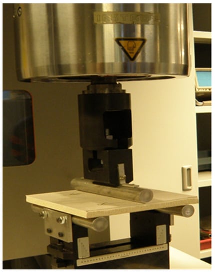 The A-type boards have been designed for usage in the compartments where the relative humidity did not exceed 70%. The usage of the K-type boards in the increased humidity environment (up to 85%) was allowed within a period not exceeding ten hours. Gypsum plasterboards were composed of a plaster core encased in and firmly bonded to outer paper liners. Due to its fabrication method, the lining and also the board as a whole showed significant anisotropic properties [,,,]. Therefore, the mechanical properties of plasterboard sheets were determined in parallel and perpendicular to the sheet production direction, applying standard EN 520 []. Conventionally, a three-point bending test of plasterboards is the established procedure for their mechanical properties assessment. Square-shaped specimens were tested in this research. The procedure consisted of the loading of two specimens sets, two pieces each, in two directions mentioned above. The flexural strength of plasterboard was defined at maximal force registered by the loading system during the three-point bending. The bending test of investigated specimens was performed by using a hydraulic MTS-858 testing machine (MTS, Eden Prairie, Minnesota, USA) of 250 kN capacity, as was shown in Figure 2. The maximal force registered by the loading system was recalculated to the stress applied to the specimens, and, therefore, at 100 N of load, corresponded with 750 kPa of stress. The investigated material was brittle and had a porosity of 20%–40%. Therefore, the measurements of the modulus of elasticity were highly dispersed and not reliable.
