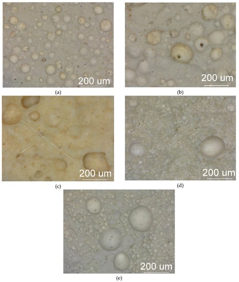 The essential stage of plasterboard fabrication is a foaming process in which the porosity of gypsum increases up to a required level. This process is driven by the addition of the surface-active agents []. Such addition result in a formation of a complex structure with large, mostly spheroidal macropores, smaller pores of irregular shape, being interlaced with blade and needle shaped crystals of calcium sulphate. Most macropores were measured with ca. 100 µm of diameter; however, smaller and larger structures were also visible. Calcium sulphate crystals were only observed by using SEM. The distribution and size of the macropores were assessed by using optical microscopy. The microstructures of investigated specimen types are presented in Figure 4.