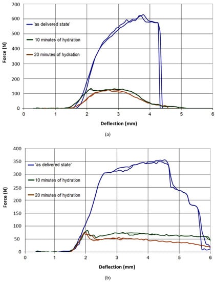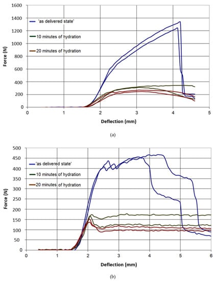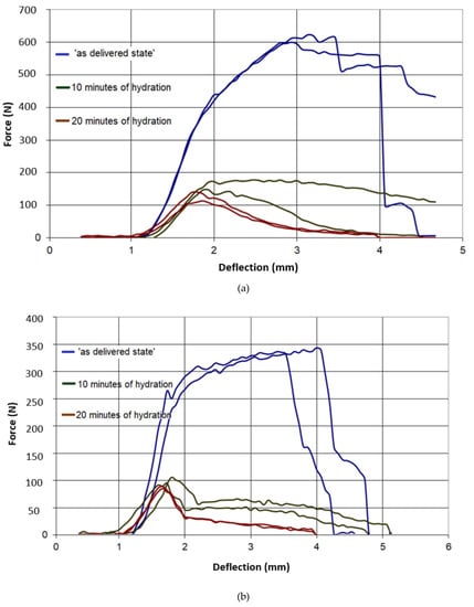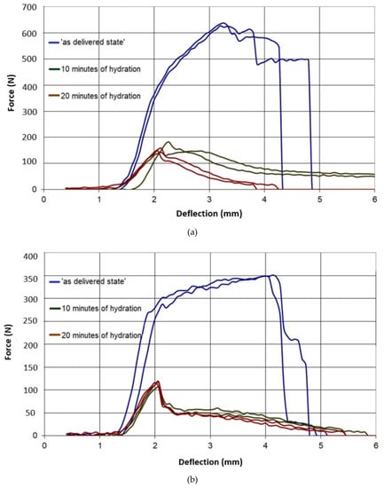 The results of all three-point bending tests are presented in Figure 7, Figure 8, Figure 9, Figure 10 and Figure 11. In these figures, the blue curves represent the behavior of the specimens in the as-delivered state, the green ones—after first hydration cycle—and the brown curves—after two hydration cycles. The results were recalculated to determine the max. stress S [MPa] occurring in the central specimens’ cross sections, using the standard formula:
