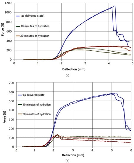 Force–deflection curves of the tested specimens of type B, (a) parallel to the sheet production direction, (b) perpendicular to sheet production direction.