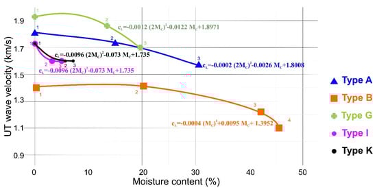The low-quality board (B) characterized by a greater contribution of open porosity exhibited the lowest value of UT wave velocity. The specific type of microstructure caused the highest increase in the material moisture content up to 47%. The theoretical model of influence of open and closed porosity on is more widely discussed in []. In that last case, quadratic polynomial function was unsuccessful due to the necessary function increase for small moisture content, which was not observed. Therefore, it is proposed to neglect the square term of the equation and apply the following formula: