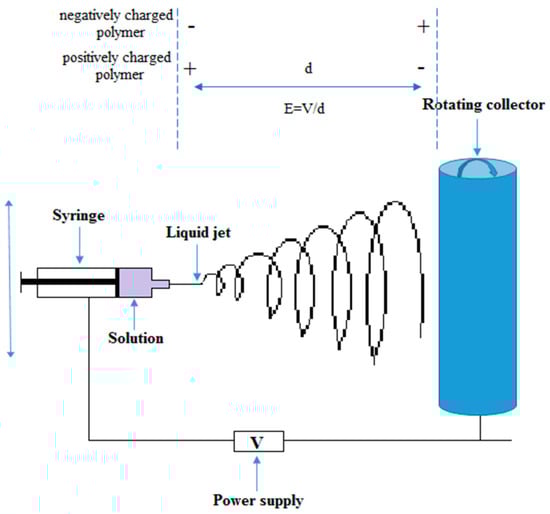 The electrospinning process is illustrated in Figure 1. A polymer is dissolved into a solvent (or is melted) before the solution is placed into a glass capillary or a syringe. An electrostatic force is applied between the drum (or the collector, plane or cylinder) and the syringe needle. When the voltage (electrostatic field) is applied, flowing polymer (in molted or dissolved form) is extruded from the needle and the droplet/fibers exposed to electric field begins to form fibers [,,]. Depending on the overall charge of the polymer molecule (chemical nature), the electric field is applied. If the polymer is negatively charged, the needle should be negative while the collector should be positive. In this way, the polymer solution is electrically forced to deposit on the collector. Certainly, if the polymer is positively charged, the electric field will be opposite (the needle will be positive and the collector negative). Equation (1) is used to calculate the applied electric field in electrospinning technique [].