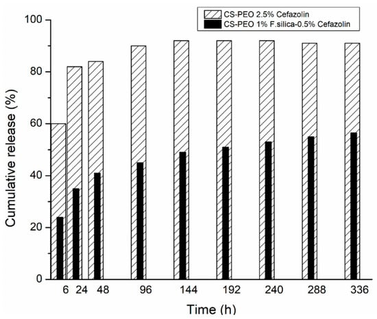 The antimicrobial effect against both S. aureus (SA) and E. coli (EC) was demonstrated using chitosan-polyethylene oxide (CS-PEO) nanofibrous materials loaded with 2.5% cefazolin (CF), 1% fumed silica (F. silica)–0.5% cefazolin (F. silica-CF). The release behavior of CF from CS-PEO materials loaded with 2.5% CF and 1% F. silica-0.5% CF was monitored for 15 days (Figure 3). The results showed an increased release of CF within first 24 h for CS-PEO mats loaded with 2.5% CF and a burst release in the first 6 h for CS-PEO mats loaded with 1% F. silica-0.5% CF nanoparticles, but afterwards the drug release was gradually made. Because the amount of CF released from the fibers, containing 2.5% drug, was much higher than the fibers loaded with 0.5% drug, the latter being more suitable for biomedical applications because the release of the drug was made more slowly. The nanocomposite membrane was evaluated in vivo on wounded skin rats, as treatment group and the results showed that the wounds of the rats were almost entirely healed after 10 days. The wounded skin of the control group was only wrapped by comfeel glue and after 10 days the skin of the rats still had some bleeding. These results demonstrated the performance of CS-PEO-F. silica-cefazolin nanofibrous mat in wound repair [].