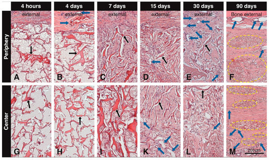 Healing of the animals did not present complications. Tissue samples were collected and processed for histological analysis according to the Material and Methods section. Wound healing outside the biomaterial was normal, as reported recently [9]. Histological inspection revealed that the porous collagen-based scaffold (Figure 1A) was present close to the bone surface at all healing periods (Figure 1B). The scaffold presented a large honeycomb-like interconnected porous structure (Figure 1A), consisting of an amorphous, sheet-like matrix (i.e., the collagenous part of the scaffold), with embedded, rod-like structures (i.e., the elastin part of the scaffold) (Figure 1C) and pores that were rapidly filled with fluid and blood cells (Figure 1C). At 90 days, residual scaffold material was still visible. It consisted of islands of the rod-like scaffold part, that were dispersed among, and well-integrated in, the surrounding host soft connective tissue (Figure 1D). For reasons of consistency and standardization, the following description of the results will be confined to the region facing the bone surface.