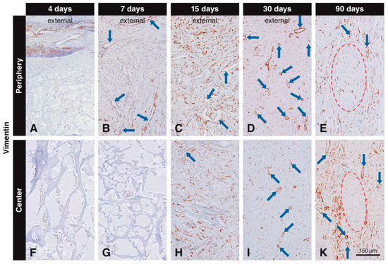 Vimentin labeling in the scaffold pores was observed, both in scattered cells and blood vessels. Vimentin+ scattered cells and blood vessels were located in the connective soft tissue next to the scaffold at 4 days (Figure 3A). No labeled cells were seen in the peripheral scaffold pores at 4 days (Figure 3A) and in the central part of the scaffold at 4 (Figure 3F) and 7 days (Figure 3G). However, many vimentin+ scattered cells and blood vessels were seen in the peripheral scaffold pores at 7 days (Figure 3B). At 15 days, many vimentin+ scattered cells and blood vessels occupied the scaffold pores (Figure 3C,H), and more vimentin+ cells were observed in the periphery (Figure 3C) than in the central part (Figure 3H). At 30 days, most of the vimentin+ cells were located in the center of the scaffold (Figure 3I), while some vimentin positive cells could still be found in the peripheral pores and in the external host tissue (Figure 3D). At 90 days, vimentin+ cells were mainly distributed in the host connective tissue surrounding the residual scaffold packages, with no differences between peripheral and central regions (Figure 3E,K). The negative controls did not show positive labeling for vimentin (data not shown).
