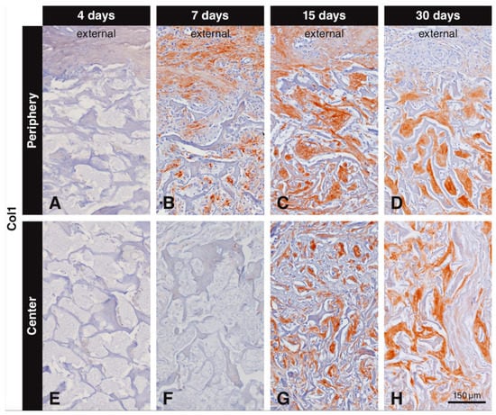 Immunohistochemical staining for collagen type I to label newly formed collagen within the scaffold pores. Collagen type I is stained in brown (DAB+). No collagen type I immunostaining is observed at 4 days (A,E), or at 7 days in the center of the scaffold (F). Collagen type I starts to fill the scaffold pores at 7 days starting from the periphery (B). At 15 days, compact structures positive for collagen type I fill the pores at the periphery of the scaffold (C) and start filling the central pores (G). At 30 days, newly formed collagen type I fills the scaffold pores, irrespective of their location (D,H).