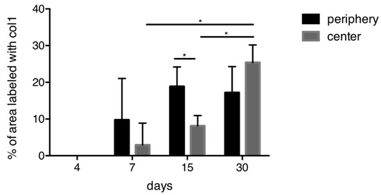 Quantification of collagen type I immunostaining showed an increase in the area occupied by immunostaining from 7 to 30 days, both in the periphery and in the center of the scaffold (Figure 5). For days 7 and 15, the areas of collagen labeling were clearly larger in the periphery than in the center. At later time points, this difference was no more visible. In the center, the immunostained area significantly increased from day 7 to day 15 and from day 15 to day 30.
