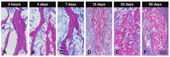 Resin sections stained with toluidine blue and basic fuchsin differentially stained the collagenous and elastin parts of the scaffold and allowed therefore to study the alterations these two constituents underwent over time (Figure 6). The collagenous part was stained in dark purple, while the elastin part was stained in dark pink (Figure 6). At early time points, collagen and elastin of the scaffold clearly stood out (Figure 6A–C). Later, the collagen part disappeared, leaving mainly elastin embedded in newly formed collagen that stained bluish (Figure 6D,E). The light blue or purple color around the elastin is newly formed collagen. At 90 days, only packages of elastin fibers were left and integrated into the newly formed soft connective tissue (Figure 6F).