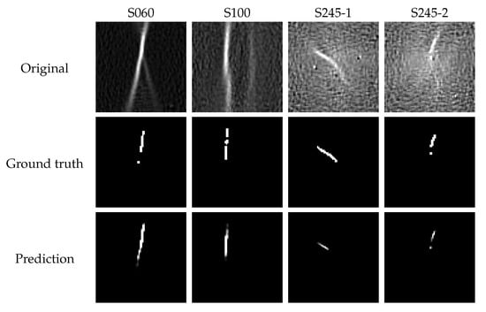 Difference strain images of AA6014 together with their ground truth annotations and predictions. Correct segmentation results are generated despite the presence of outliers in S245-1 and S245-2. In S245-2, an outlier is incorrectly included in the ground truth mask and predicted accordingly. The single pixel in the ground truth mask of S060 is a result of the mask generation process and not really an outlier, as it occurs within the necking structure. The same accounts for the discontinuity in S100.