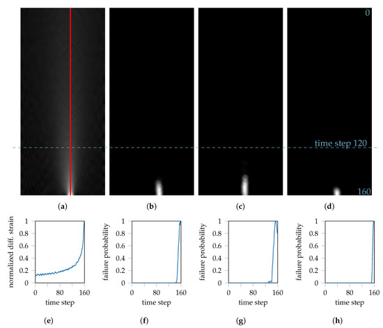 The in-depth investigation of DP800-S050-1 compares the critical forming period that emerges after time step 120 of the forming process (cf. Figure 5a,e), by contrasting the line profile of the difference images (cf. Figure 6a) to the corresponding line profile of the necking probability (cf. Figure 6b) to emphasize their different development. For this purpose, the difference images are compared with the predicted segmented masks at several points in time, so that the necking area and its extent are visually highlighted. The line profile of the difference images in Figure 6a reveals no significant increase up to the time point 155. The difference images at the respective points in time 142–150 (cf. Figure 6c–e) also do not exhibit a clear necking that is easy to identify. Visually one could suspect that localized necking starts at time point 150 (cf. Figure 6e), whereby this can not be recognized distinctly until time point 155 (cf. Figure 6f). At time point 160 (cf. Figure 6g), i.e., the last image of the forming process, a well-defined necking region can be identified. When investigating the corresponding predictions (cf. Figure 6b), individual pixels are already classified as belonging to the necking class at time point 142 (cf. Figure 6h), whereby the localization effect occurs at another position in the image area in comparison to the remaining predictions. Beginning with time point 148 (cf. Figure 6i), a small connected area is identified, which constantly increases until the end of the forming process at time point 160 (cf. Figure 6l). To emphasize a well-defined necking area, the predictions were spatially and temporally smoothed using a standard 3D-mean filter for image processing.